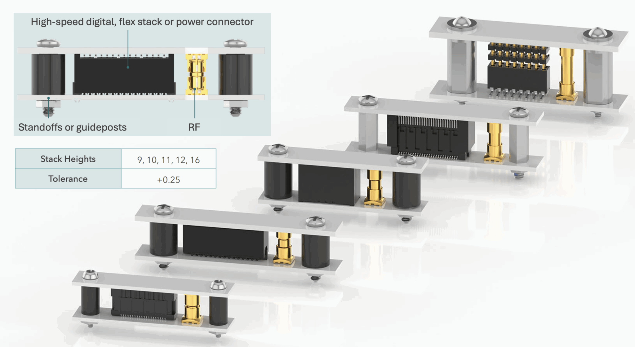 Samtec 深知这一点带来的痛点。因此,他们把“高度同步”作为其连接器系列的主要设计目标。说真的,他们精心设计了 RF/模拟连接器,使其与高速数字和电源连接器拥有精确匹配的堆叠高度。